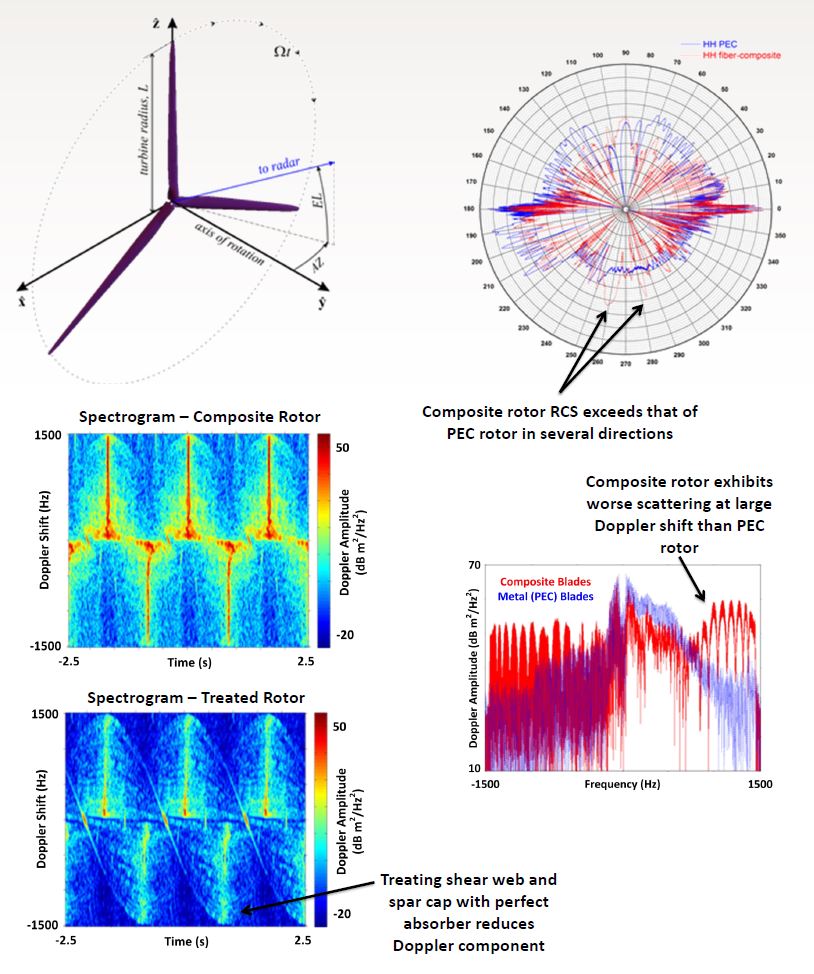 The large radar cross section presented by wind turbine blades is known to interfere with radar operation, and the Doppler shift caused by blade rotation can limit a radar’s ability to identify and track moving targets. To reduce wind turbine radar interference, Sandia developed a low-cost composite laminate treatment compatible with current blade manufacturing processes. This treatment, which addresses all components of a blade’s cross section, was modeled and shown to reduce RCS interference by 20 dB.